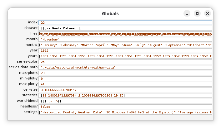 dataset: Agis:RasterDatasetobject, from the GIS extension, containing the climate data for the current tick’s file index. Created by thegis:load-datasetcommand. -