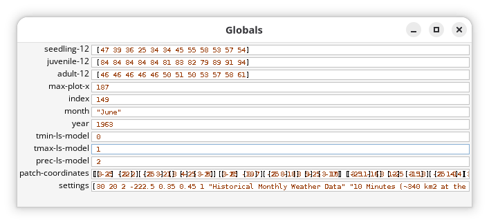 index: Anumberrepresenting the index of the files being used in the simulation. It always starts at 0 and is incremented by 1 at each tick. It is directly related to thefilesglobal variable, as it indicates which file from the list is currently being used to update the climate data in the model. -
